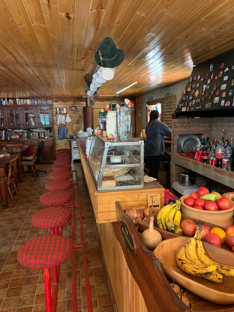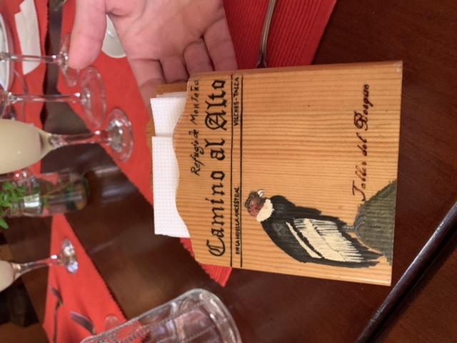 Next it was time to find a hidden little gem in the woods for lunch. We climbed through the barbed wire fence, a short cut. It was a gentle incline for about 10 – 15 minutes. We all thought we were having lunch in a shack. Then out of no where, this beautiful building appeared. The restaurant owner, Eduardo greeted us at the gate with a traditional double cheek kiss. The building was built by hand, no electricity, they run on generator. They have no internet. People find this place as they stumble upon it while hiking. Hikers and trail guides write it up on their Facebook pages, so hikers from all over the world know to look for it. They say they serve a lot of Europeans. Eduardo and his wife Ingrid, have their house attached to the restaurant. The restaurant has two tables indoors, with some stools at a counter. There are tables outdoors, but we preferred the coolness of the indoors. Ingrid prepares all the food, and she said her husband helps out with the dishes. They are an adorable couple. We noticed these beautiful wooden napkin holders, with a bird and the name of the restaurant. We later found out, Ingrid paints these, at night, by candle light. She showed us some of her other art work. Clearly cooking isn’t her only talent.