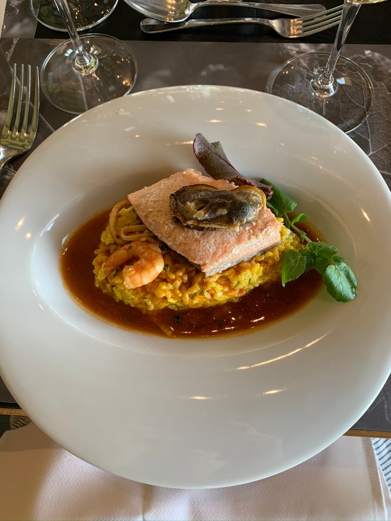 The third course was Rissotto de moluscos y crustaceos, servido con salmon confitado en oliva y salsa bisque atomatada. This was paired with a crisp Moscatel, La Causa. I’m not a fan of this type of wine, but I was pleasantly surprised. The risotto was delicious.