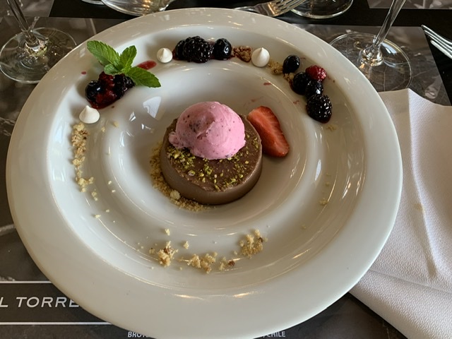 Finally it was time for dessert. It was to die for! Semifrio de chocolate amargo, acompanado de berries macerados en almibar y sorbette de arandanos. This was paired with a Riesling, Nectaria. I knew once they told us it had nectar in it that it would be too sweet, thick. This was the only wine none of liked. This group never leaves wine on the table, none of us finished the glass they poured us.
