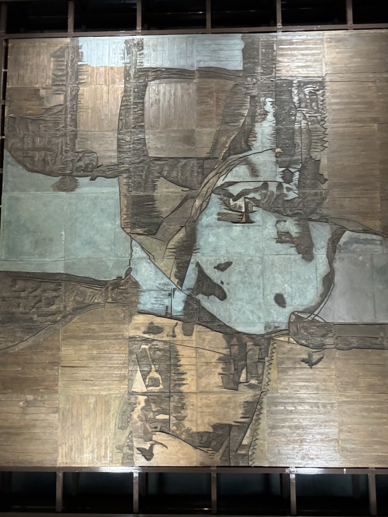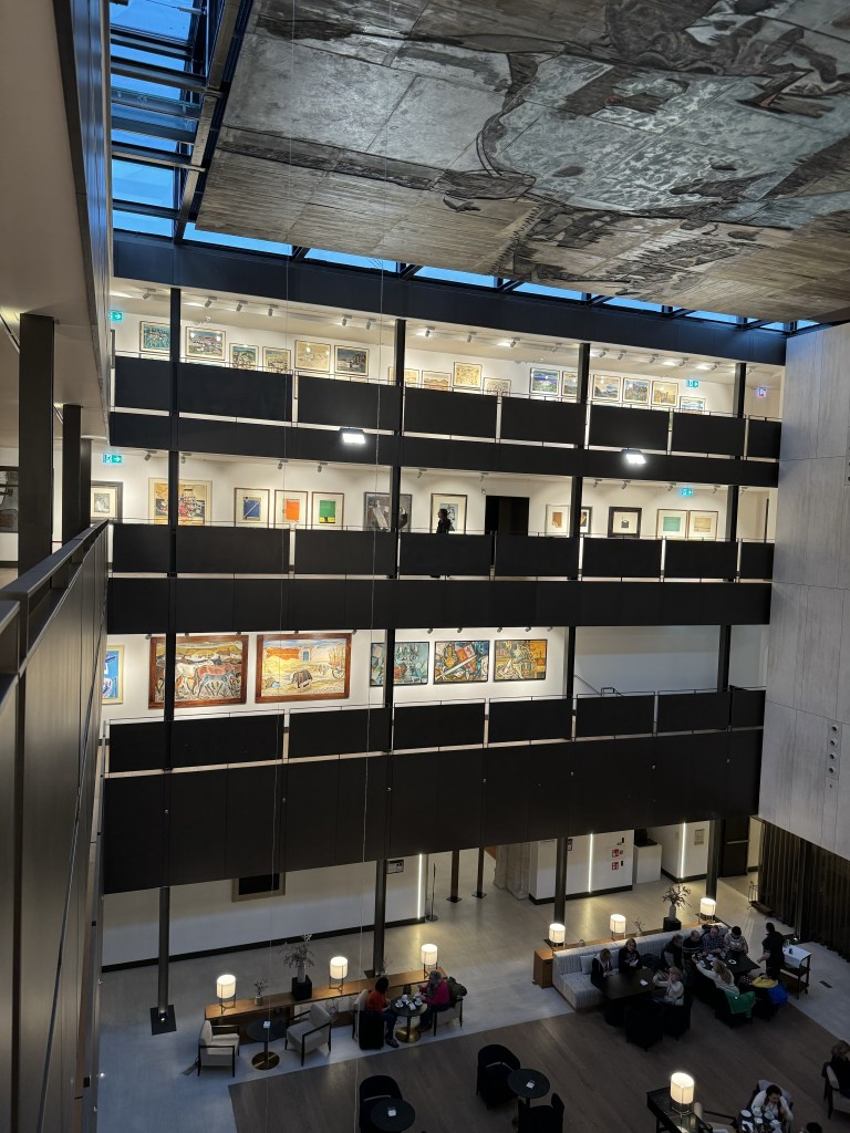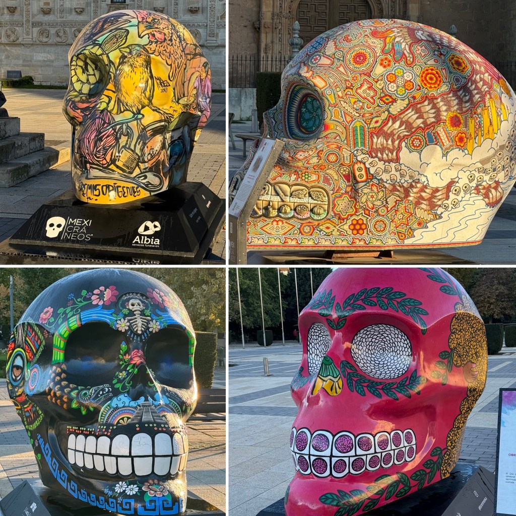 We ended our day at another beautiful Parador – Hostal San Marcos. This is a 5-star parador built in the 16th century by King Ferdinand. It was refurbished and reopened a few years ago. The architects did a beautiful job integrating the new with the old. It is a “green” building. The lighting system takes a PhD to figure out, but this hotel was outstanding. From the open center, you can see down to the lobby bar, and lining the halls were beautiful works of art. It was like staying in a contemporary museum – and yes, I enjoyed this artwork more than the museum in Santiago de Compostela. Even the ceiling is a work of art. If you want a glimpse of this hotel, it is the Leon hotel in the movie The Way, although it looks a bit different inside. Outside the parador was an art instillation of decorated skulls. I wish we were here another night!