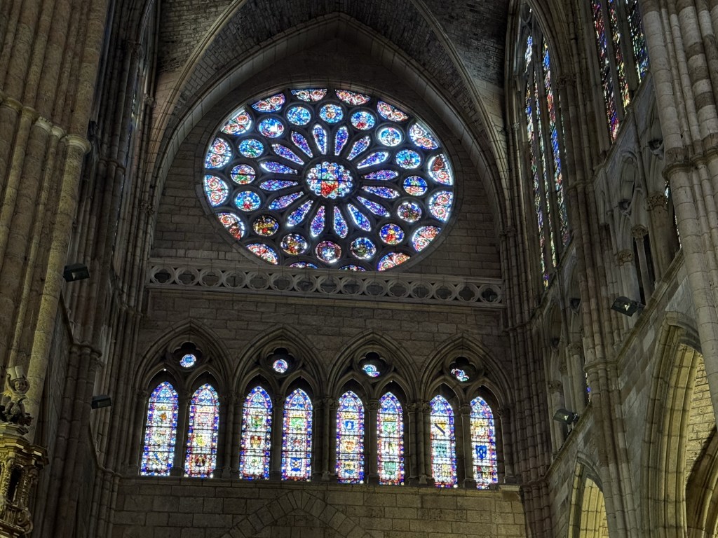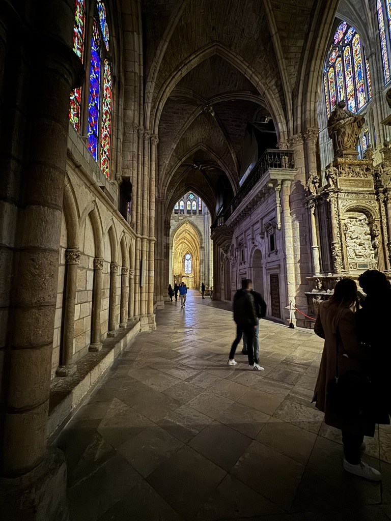 Santa Maria de Leon Cathedral is a massive Gothic cathedral. What makes this one so special and unique – the stained glass; it is stunning! The cathedral houses 125 large windows and 57 round windows. I wish we had more time to spend to admire the beauty. These windows were created from the 13th through the 20th centuries.
