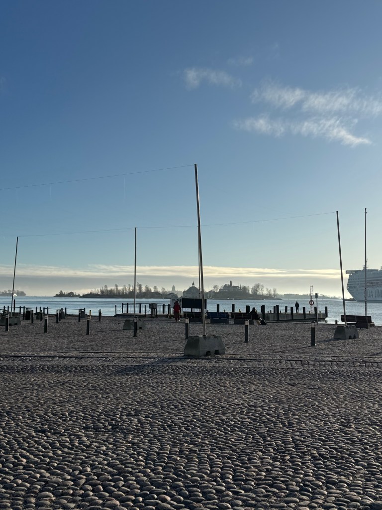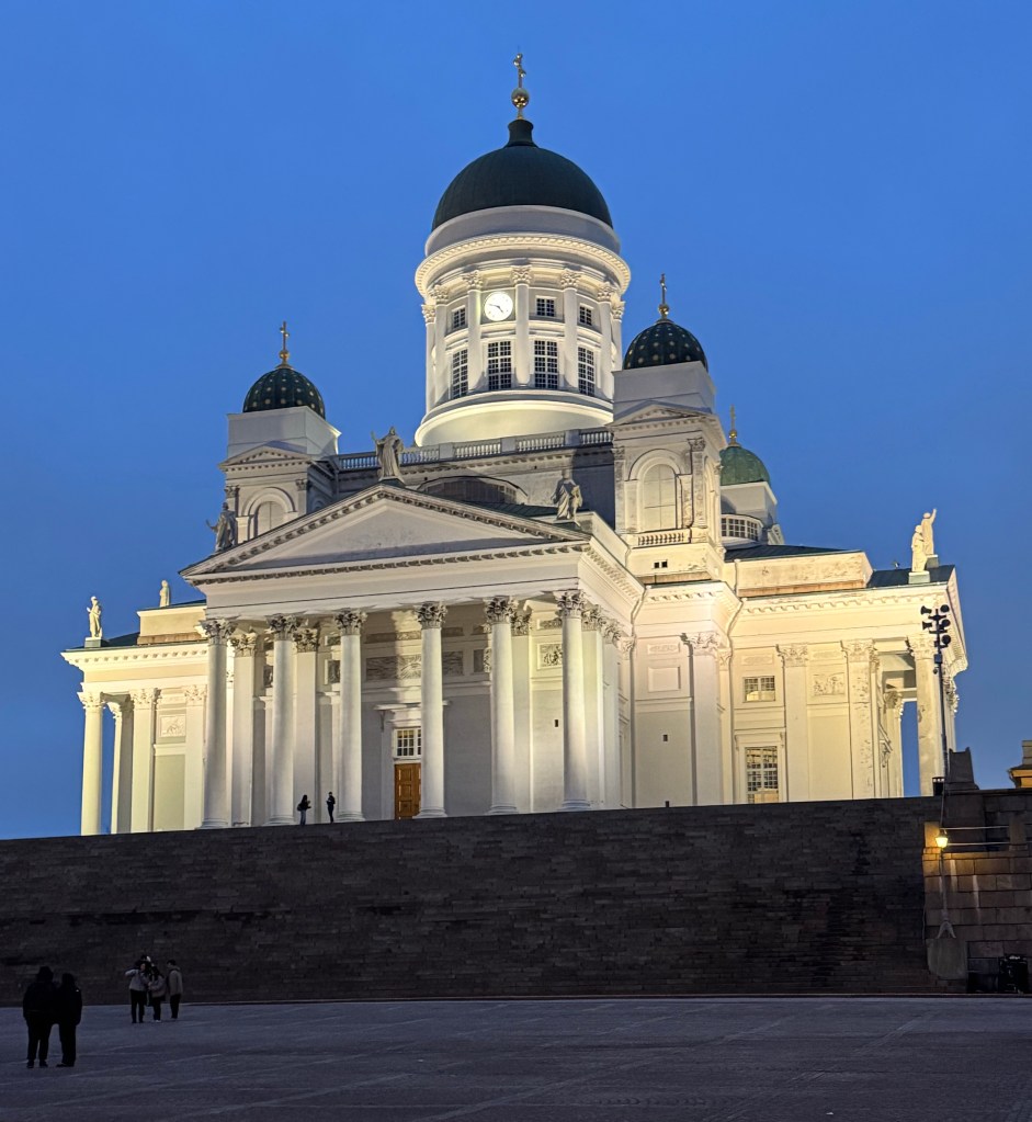 Since it was getting towards dinner time, Laura and I decided to do a bit of exploring towards the water and headed to Helsinki Cathedral. In the darkness the beautiful white Lutheran church stood magnificently high above us. We walked up the stairs and took in the views for bit. It was peaceful with very few people walking around. Our next mission was to find coffee. It’s very easy in this city. Helsinki has a large number of cafes, and it was nice not to see a Starbucks on every corner, but rather cafes with cozy places to sit and converse with friends. They offer great European coffee drinks and many tempting sweets. For dinner we decided on Italian, and at Olivia’s I had a fabulous Neapolitan style pizza with my favorite taleggio cheese, along with a microgreens salad perfectly dressed. The atmosphere in the restaurant was comfortable and relaxing, and in typical European fashion they didn’t rush us through dinner, and we sat there for quite some time with a couple glasses of wine.