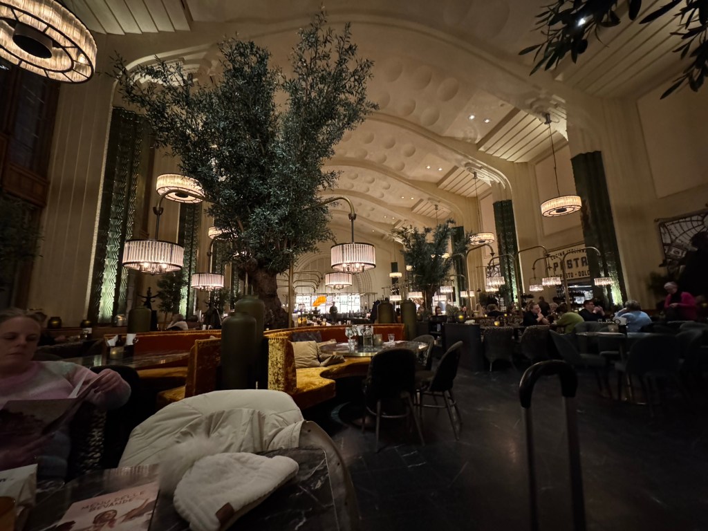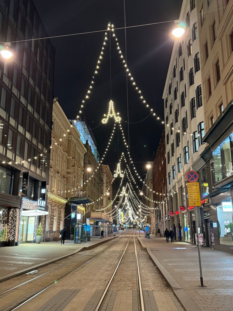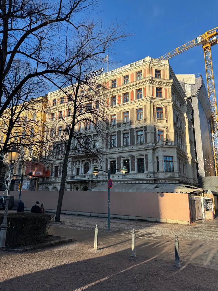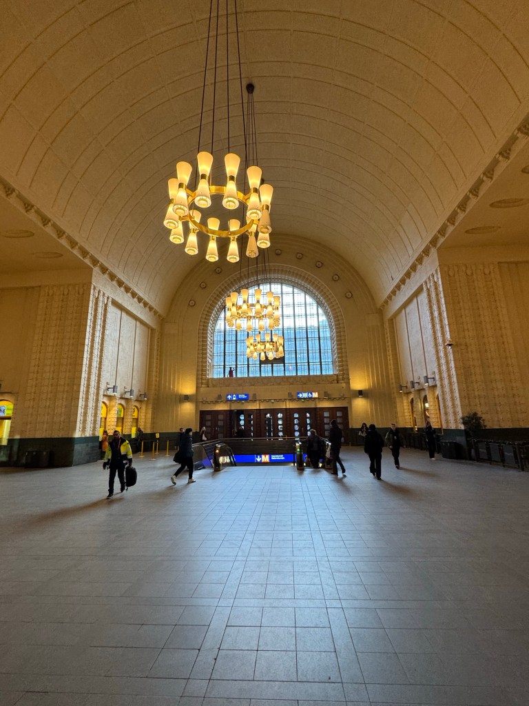We arrived in Helsinki around 1:30pm, and the first thing we noticed was how “zen” the airport was. Wide open spaces, big clean windows letting in natural light, chaise loungers, plenty of enticing food options, and a northern lights experience lounge. It was nothing like the dismal Terminal 8 at JFK we had departed from the previous evening. Laura and I sailed through immigration, then started following the signs to the train, passing countless more shops and restaurants. Once in the underground station, we purchased our tickets from the vending machine, and for just over €4, we were on our 23 minute train ride to Helsinki Central Station. We then navigated our way through the city streets to our hotel, the beautiful historic Hotel Kamp built in 1887.