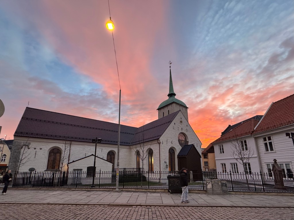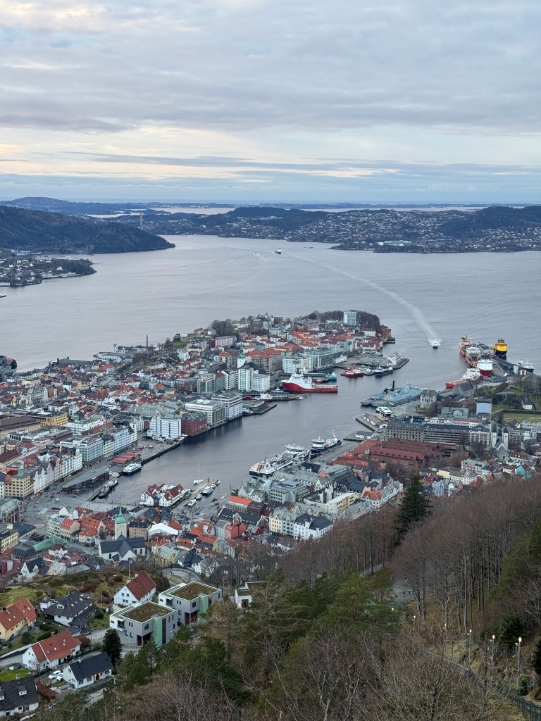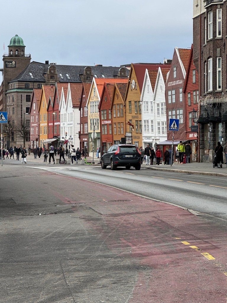 We headed straight to the Bryggen area of Bergen, the area most seen in photos and a World Heritage Site with historic wooden houses along the wharf. The area deemed a World Heritage Site is located between two large black posts on the sidewalk. Some of the buildings at the end of the wharf are newer replicas of the wooden houses that once stood there; the originals burned down in a fire in 1955. We then went to lunch at the fish market. During the warmer months they say you find vendors outdoors, but during this time of year, they are inside one building along with restaurants. I wish we had more time for lunch to have eaten at one of the restaurants versus ordering to-go. As I placed my order for my shrimp sandwich, I was envious of the plate full of fresh fish that went by to be served to a restaurant customer. You definitely have to eat here if you like fish.