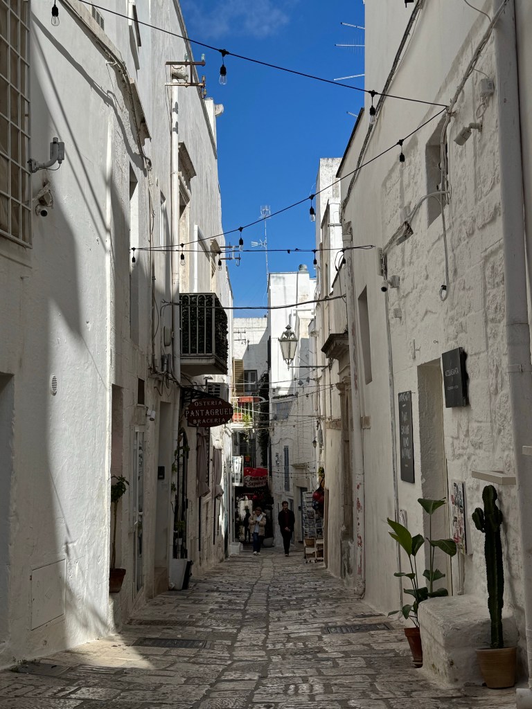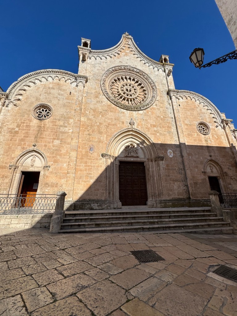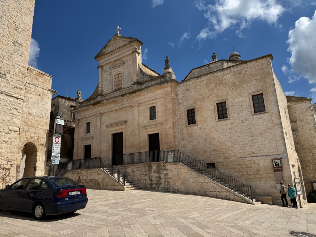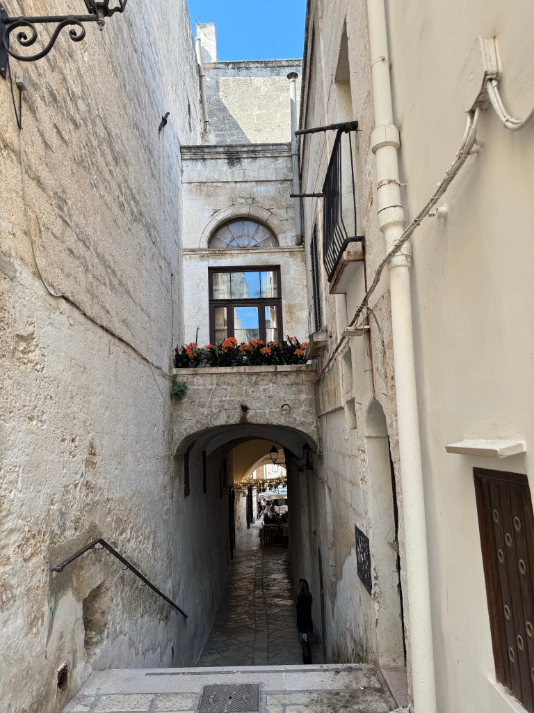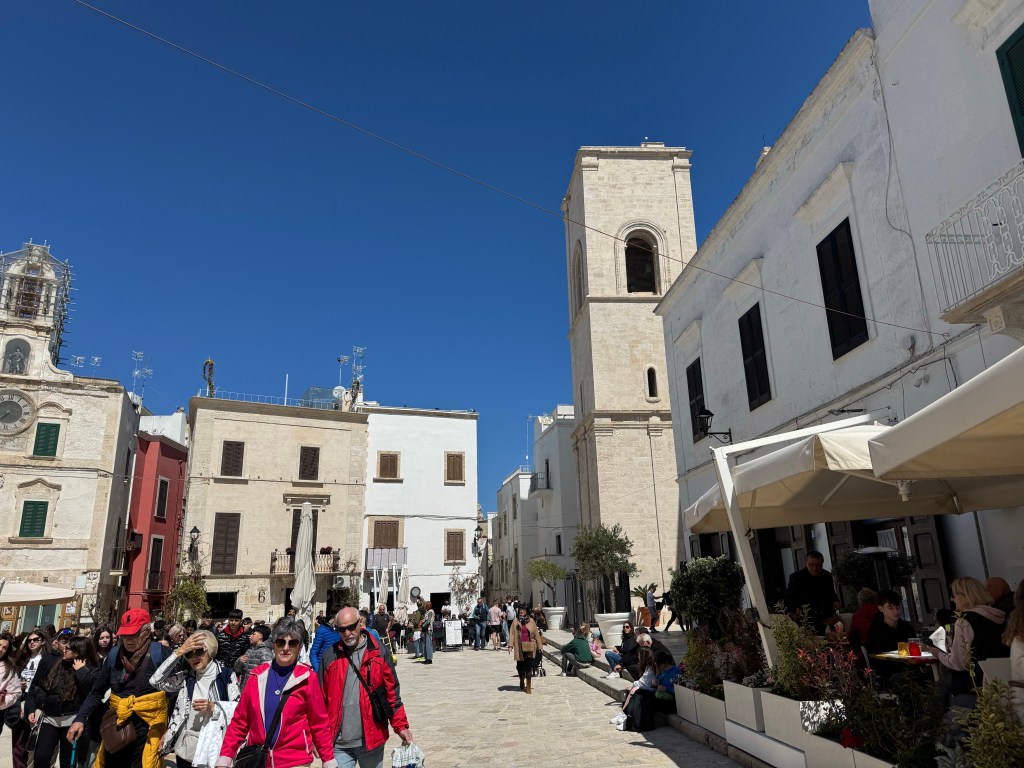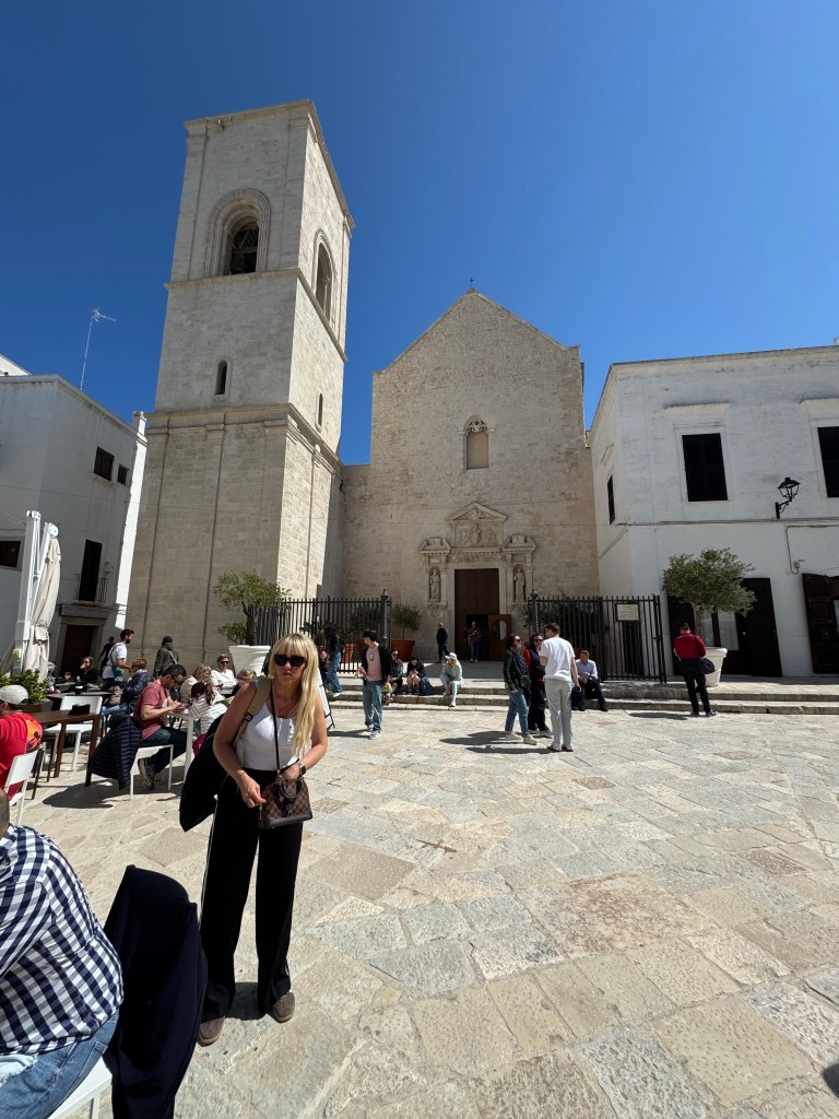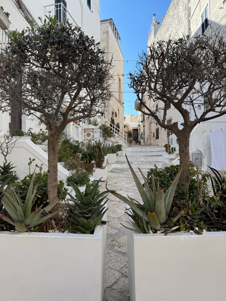 From Cisternino we drove to Ostuni, “La Citta Bianca” or “The White City”, aptly named due to the white walls around the city and the white painted buildings within the walls. If I were to stay overnight in one of these towns, this is one I’d pick, along with Monopoli. It was more lively than Cisternino, and we passed so many cafes, bars and restaurants. Wearing shoes with good treads is a must as the cobblestones are slick, and it is very hilly. There is not a lot of traffic, but you do need to keep a look out on some of the “main roads” that can actually fit a car. There is a large piazza in the center with many cafes, but I recommend you wander the streets away from the center and see what hidden gem you find for a sweet treat or beverage. As you climb the streets you will come to the large Duomo di Santa Maria Assunta (aka Ostuni Cathedral). We were told much of the inside is not the original and it is a shame they have covered the large flower window in the front so the light does not shine in the church. Across from the cathedral you will see the beautiful Arco Scopa, a covered walkway connecting the Bishop’s Palace and the seminary. We enjoyed cocktails in a fun, modern bar, Riccardo Caffe, and had dinner at Casa San Giacomo where Madonna has celebrated two of her birthdays.