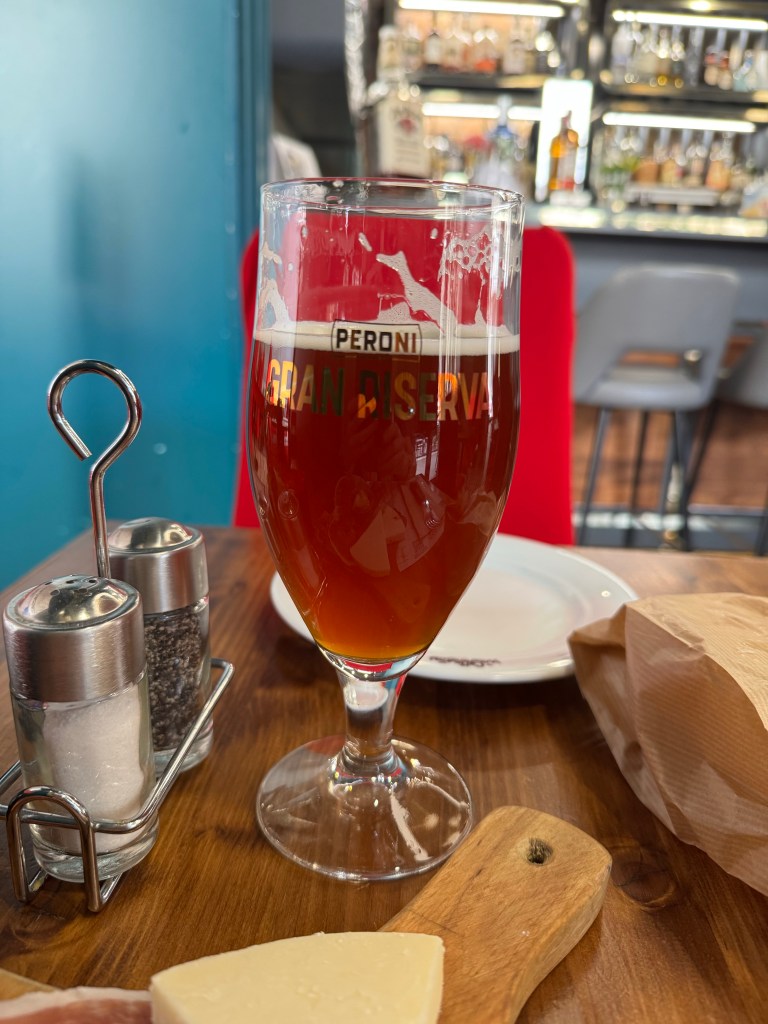 After the Colosseum, I made my way to the Vittoriano, the national monument in honor of Victor Emmanuel II. From the Colosseum I could see the massive sculpture on the roof top, and I wanted a closer look. It was beautiful even with all the construction going on around it. I need to add this site to my list of places to visit next time I’m in Rome. I was getting tired, so I made my way back towards my hotel which was near Roma Termini. I stopped at a cafe for a light bite and a beer. Who knew Peroni had an amber beer, Peroni Rossa, and it was quite tasty. I needed sleep, and I was hoping day two in Rome would make me fall in love with the city or at least entice me enough to want to come back.