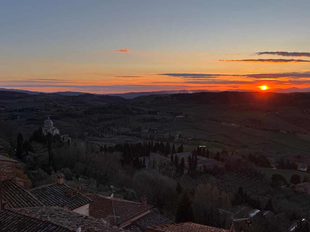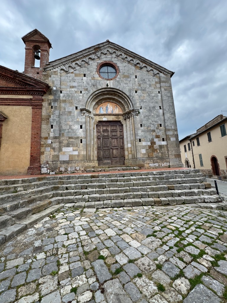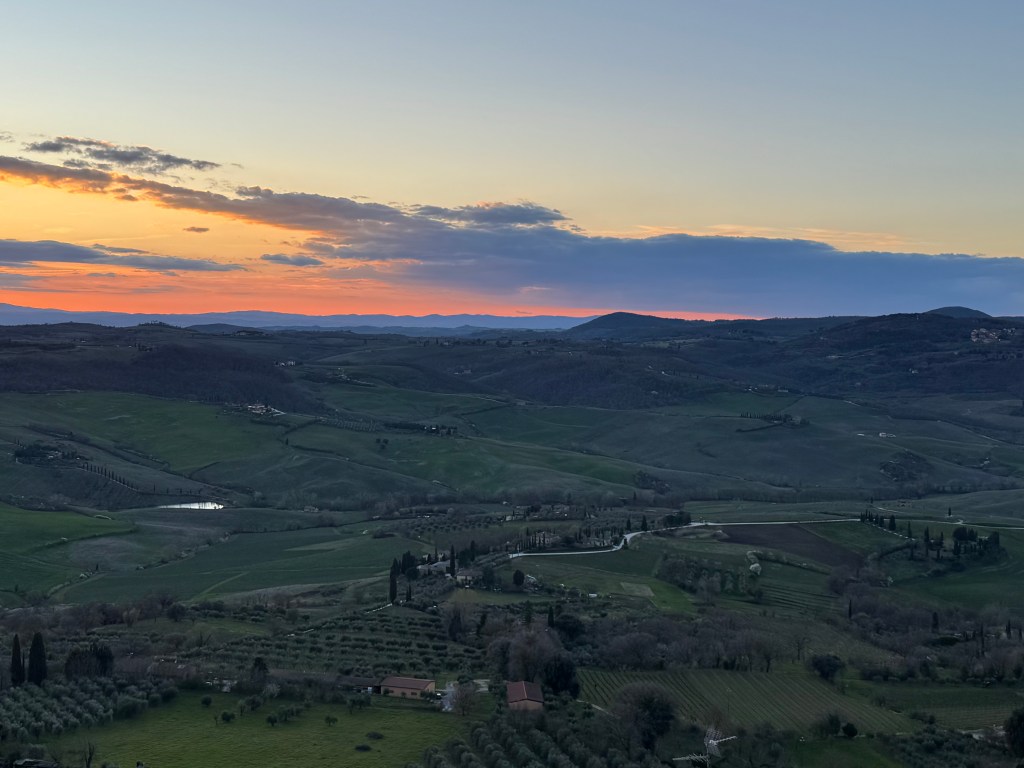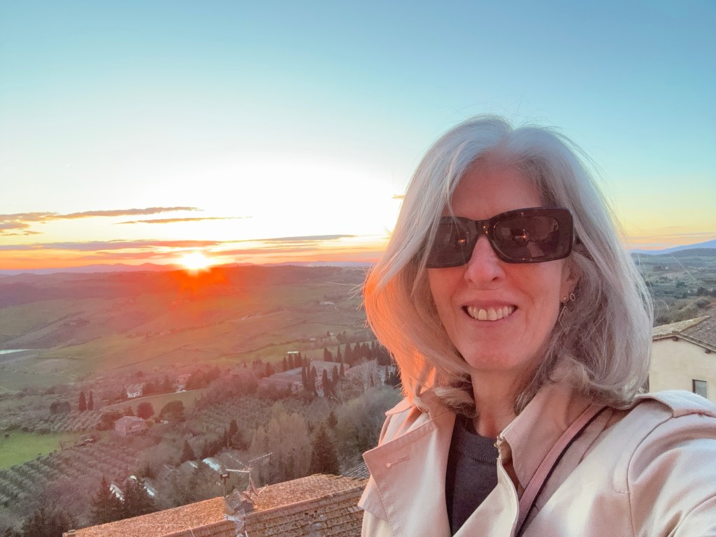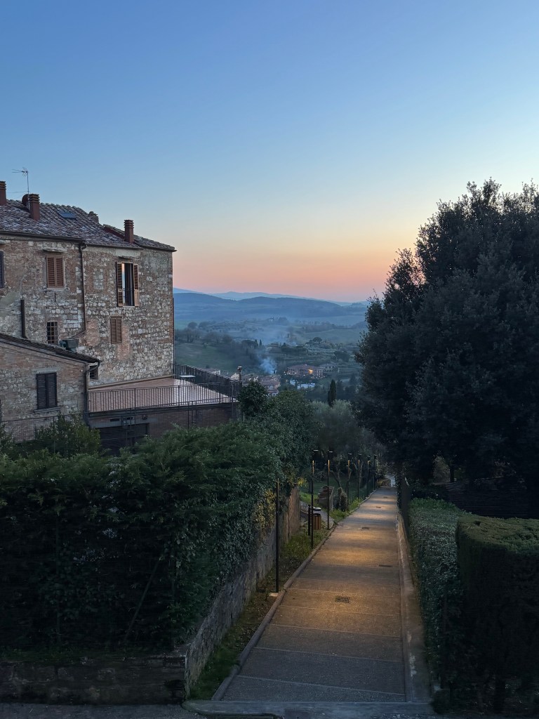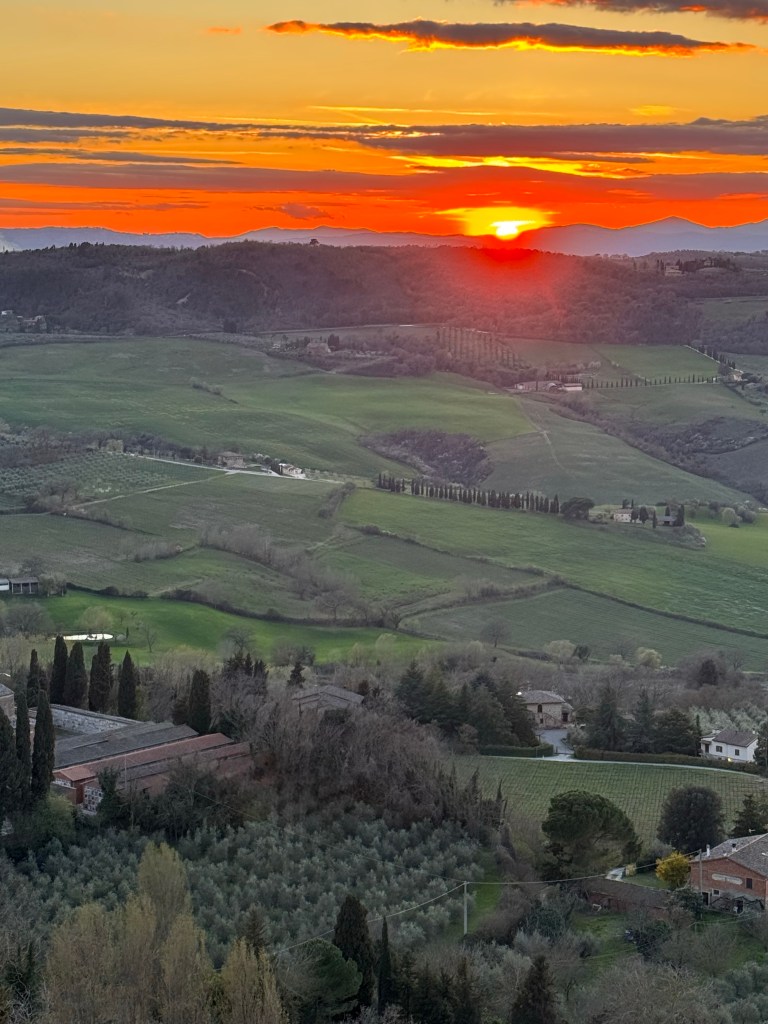 Tramondo – the Italian word for sunset, and they are spectacular here, especially when you take a walk to the edge of town and overlook the beautiful Tuscan hills. After my classes on Tuesday, the sky was clear, and I knew it would be the perfect opportunity for some pictures. It was also the perfect opportunity to reflect on how fortunate I am to be here living my dream for a few weeks. While enjoying the views, a nun was sweeping the church entryway. She pulled out her cellphone and asked me to snap her photo with the beautiful sunset behind her. That was my good deed for the day!