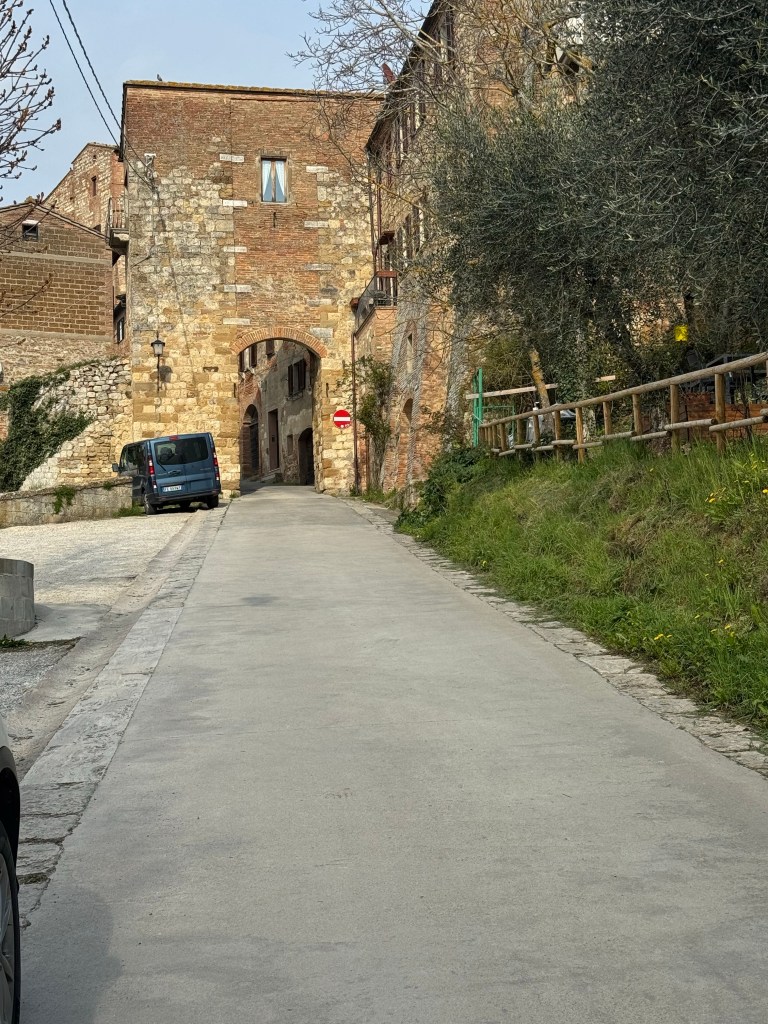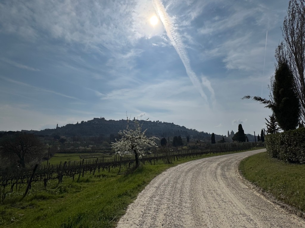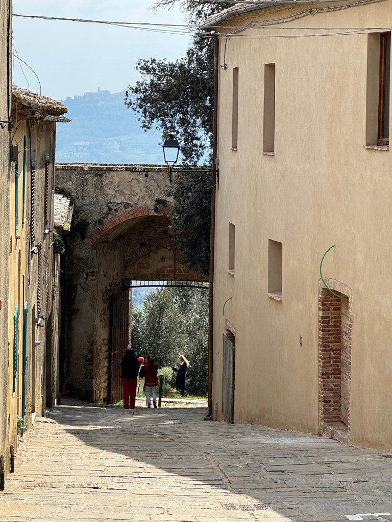 To cap off my first week, I decided on Saturday to walk to Montefollonico. The small hill town about 7km away, and yes, part of your walk to and from is fairly steep, but thankfully in both directions you start going downhill first. You can see Montefollonico and the dirt road you walk to get there from Montepulciano. Very few cars take the dirt road, as there is a paved road from another direction; this makes the walk peaceful, and a wonderful opportunity for self-reflection.