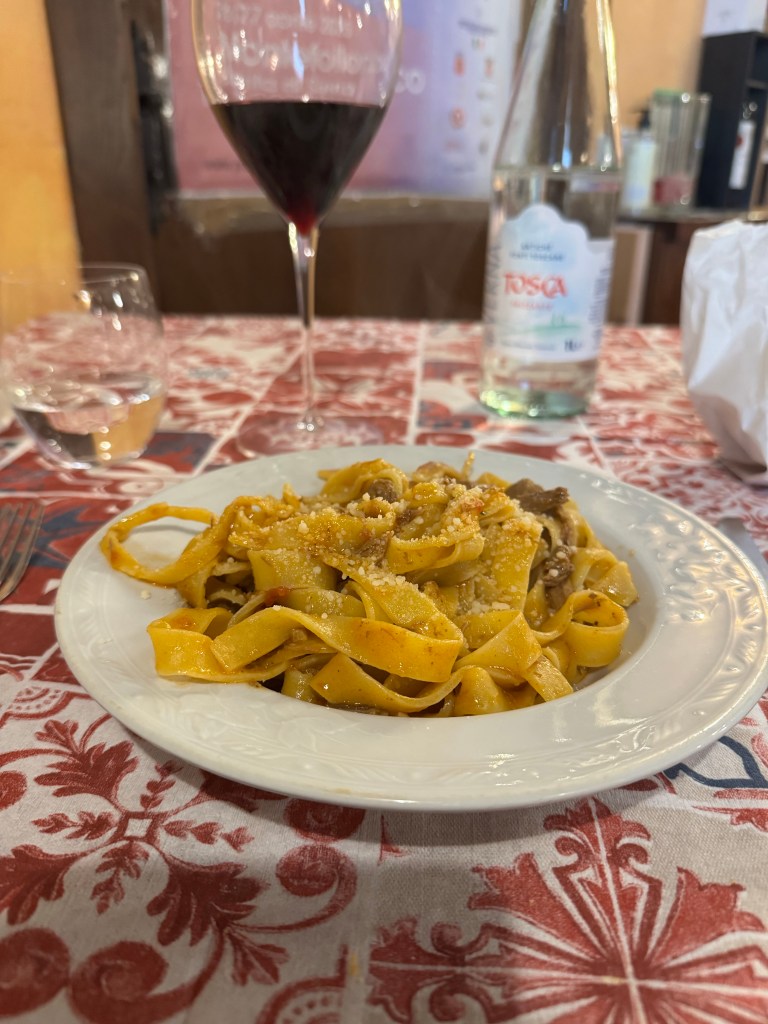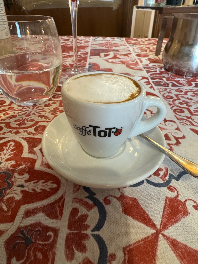I decided with all the walking I had done, plus what I still had ahead of me on my journey back, I deserved a delicious pasta lunch. I got to the restaurant about 10 minutes after they opened, and there was only one couple seated. In Italian I asked for a table for one, and luckily although most tables were large, there was a small one in the corner of this tiny establishment. The restaurant is owned by a couple, the husband waits tables, and the wife does the cooking. There was one other gentleman helping to serve food. Within 20 minutes after my arrival the place filled up with families. It was fun to listen to their conversations, and I realized I could understand much of what they were saying. I also noticed no one had out their cellphones. It was multiple generations sitting at tables, nonnas, nonnos, zias, zios, parents, children, all conversing, the entire two-plus hours I was there. What a stark contrast to what you typically witness back in the US where most people are engrossed with their phones while ignoring their meal companions. After my macchiato, it was time to head back. When I returned, my legs were a bit sore, but what a wonderful day, and the perfect way to wrap up my first week.